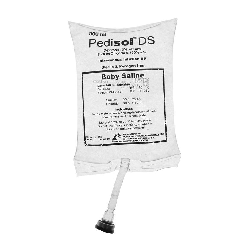 Pedisol DS is indicated when there is combined water and sodium depletion. It provides Dextrose as a nutrient in a suitable medium of Sodium Chloride which is isotonic to body fluid, or it may also be employed as a source of isotonic Sodium Chloride or both. It is usually used in the maintenance and replacement of fluid, electrolyte and carbohydrate in patients who are unable to take fluid and nutrients by mouth e.g. in case of persistent vomiting, during and after surgery, shock or accidents.