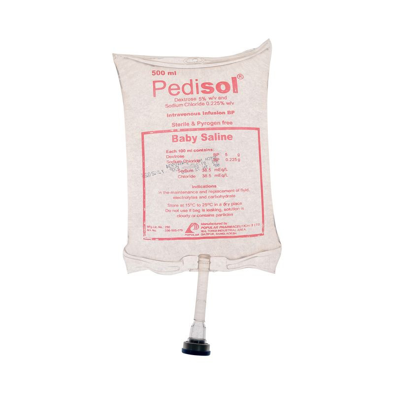 Pedisol is indicated when there is combined water and sodium depletion. It provides Dextrose as a nutrient in a suitable medium of Sodium Chloride which is isotonic to body fluid, or it may also be employed as a source of isotonic Sodium Chloride or both. It is usually used in the maintenance and replacement of fluid, electrolyte and carbohydrate in patients who are unable to take fluid and nutrients by mouth e.g. in case of persistent vomiting, during and after surgery, shock or accidents.