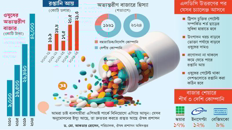২০২৬ সালে বাংলাদেশ স্বল্পোন্নত দেশের (এলডিসি) কাতার থেকে উন্নয়নশীল দেশের তালিকায় প্রবেশ করতে যাচ্ছে। এই উত্তরণ বড় অর্জন হলেও এতে বাংলাদেশের ওষুধশিল্পের জন্য নতুন ধরনের চ্যালেঞ্জ তৈরি হবে। এলডিসি মর্যাদার কারণে বাংলাদেশ এতদিন ট্রিপস চুক্তির আওতায় ফার্মাসিউটিক্যালস পণ্যে পেটেন্ট সংরক্ষণ থেকে অব্যাহতি পেত। ফলে বাংলাদেশি কোম্পানিগুলো পেটেন্ট না থাকা সত্ত্বেও উদ্ভাবনী ওষুধের জেনেরিক সংস্করণ তৈরি ও বিক্রি করতে পারত। যে কারণে দেশের জনস্বাস্থ্য, ওষুধের দাম এবং রপ্তানি সক্ষমতায় সহায়ক হয়েছে।